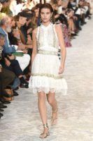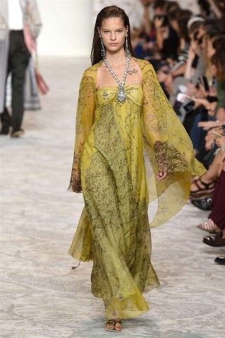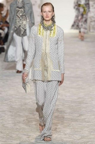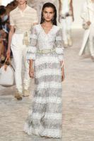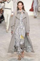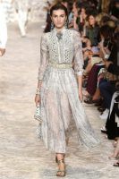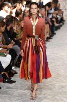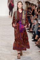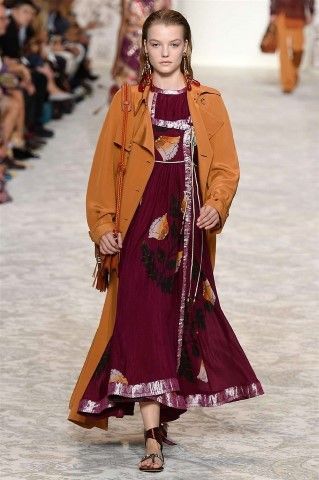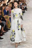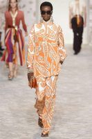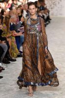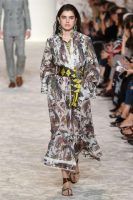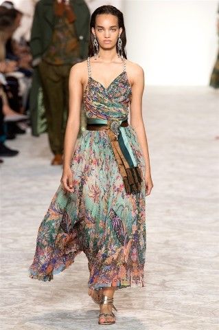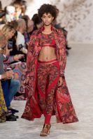 Proprio come un lungo e appassionante viaggio, la collezione Etro per la prossima primavera estate 2018 ci porta dritti dritti in mondi ed epoche lontani. Il fashion show firmato Etro di oggi è stato come un affascinante tour che ha toccato le coste dell’Africa e quelle dell’India, le magiche capitali degli zar e le lontane isole oceaniche, gli sfarzosi palazzi veneziani e quelli Art Deco di Vienna. Tantissime sono le ispirazioni tratte da mondi esotici che Veronica Etro è riuscita, in modo quasi alchemico, a trasformare in splendidi e fastosi outfit. Impossibile identificarle e raccontarle tutte, tanto sono numerose e mixate fra loro. Ricco di decori, stampe batick e sontuosi ricami, ogni singolo pezzo della collezione è qualcosa di assolutamente unico, che cattura magneticamente lo sguardo e fa sognare. Se avviciniamo lo sguardo scopriamo un universo di motivi paisley, floreali e animalier, di righe e di punti, dissimulati nell’allegria dei colori e nella straordinaria ricchezza di elementi. Minimo comun denominatore di tutti gli abiti visti in passerella sono, oltre alla preziosità dei tessuti e all’opulenza dei motivi grafici, le forme fluide e piacevolmente easy da portare. I trench scendono morbidi fino alla caviglia. Gli sfarzosi abiti-pijama regalano alla figura femminile un’allure sofisticatamente rilassata. Le lunghe gonne in pizzo bianco oppure in chiffon trasformano il lusso in qualcosa di comodo e di piacevolmente confortevole. Le lunghe giacche kimono avvolgono il corpo e accompagnano leggere l’andatura.