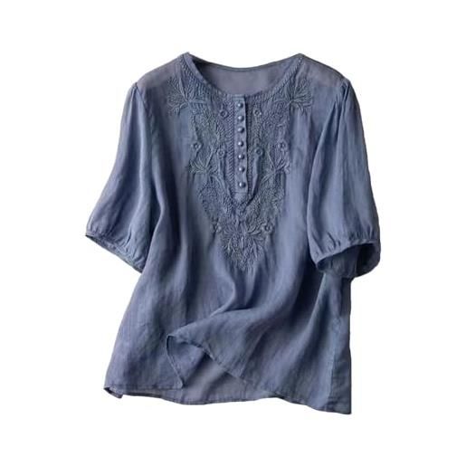 UIOKLMJH camicetta da donna in stile etnico vintage ricamato, in cotone e lino, casual, scollo rotondo, maniche corte, camicie larghe, colore 1, xxl