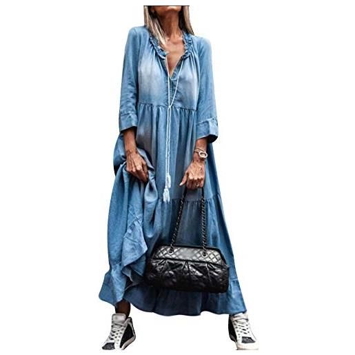 Yesgirl abito estivo da donna boho in denim estivo donna casual jeans scollo a v maniche lunghe gonna a pieghe a-line maxi denim camicia a tunica abito camicetta a azzurro l