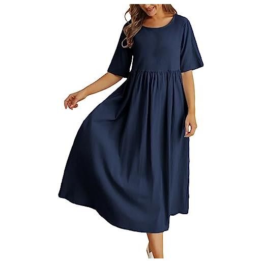 Generic abito in lino da donna, estivo, casual, a maniche corte, lungo, elegante, a tunica, leggero, traspirante, con tasche, per il tempo libero, a vita alta, blu marino, l