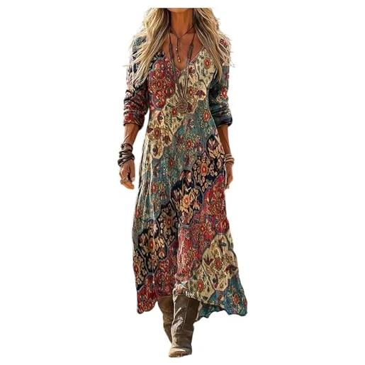 Mfhmom vestito lungo donna estivo lino cotone manica 3/4 scollo a v stile boho hippie vintage abito maxi etnico geometrico caftano da spiaggia mare casual largo taglie forti comodo vacanza