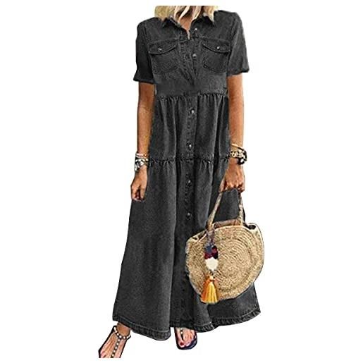 ORANDESIGNE vestito di jeans donna lungo estivo denim abito scollo a v manica corta vestiti elegnati curvy maxi vestitino jeans casual abiti con tasche e bottone a nero xxl