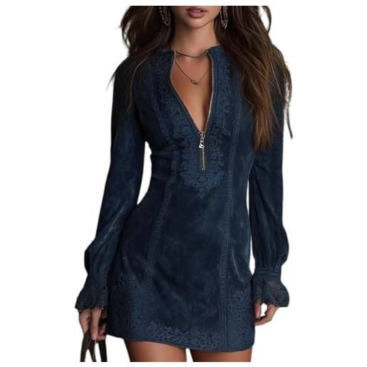 Generisch mini abito in camoscio mezza zip donna western cowgirl pizzo scollo a v manica lunga sexy aderente look retrò, marrone, xl