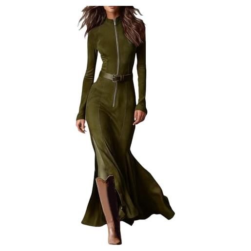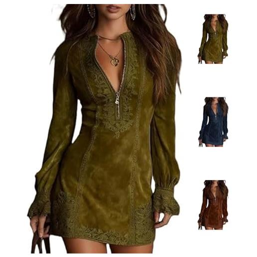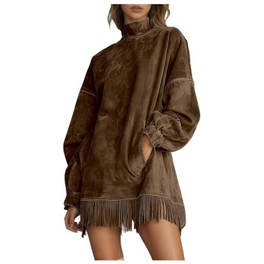 Generico abito maxi in camoscio retro western donna - elegante patchwork con cerniera bordo cowgirl maniche lunghe minivestito monocolore stile chic(coffee, m)