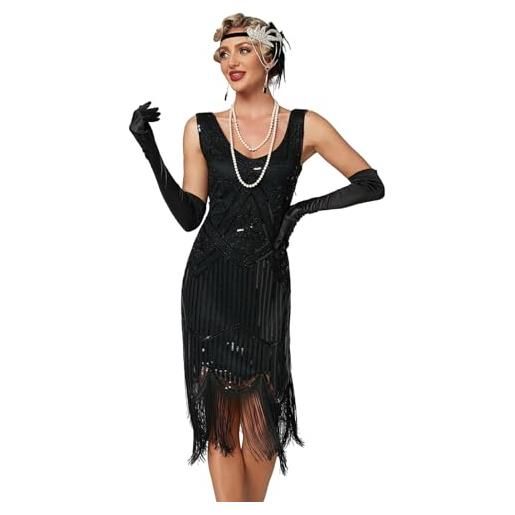 BOTCAM abito da sera da donna lungo, anni '20, great gatsby, abito da sposa con paillettes, nappa, scollo a v, senza maniche, nero, xxxl