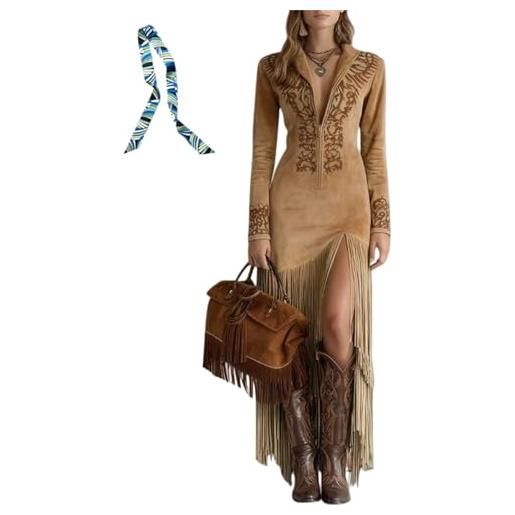 Generisch abito da cowgirl da donna in pelle scamosciata, stile vintage, abito da cowboy, con mezza zip, con nappa, a maniche lunghe, stile retrò, marrone, l