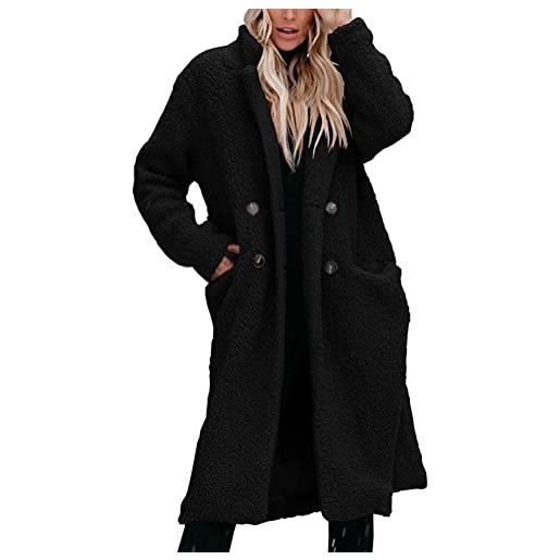 ZH8FCHAN cappotto teddy donna invernale elegante casual giacca lunga cappotti peloso pelliccia trench con risvolto doppiopetto peluche orsacchiotto cardigan lungo fleece jacket cappotto nero donna lana