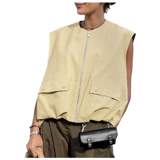JAWINT gilet cargo da donna, casual, con cerniera, oversize, girocollo, orlo increspato, senza maniche, blazer, beige, small