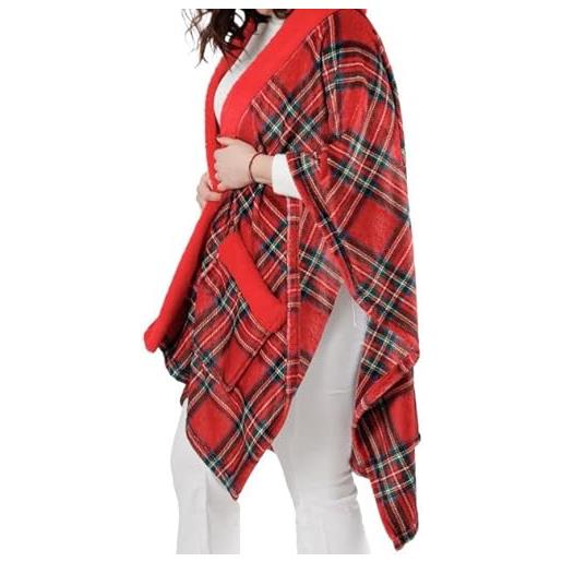 INTRECCI mantella scottish tartan rossa con tasche, morbida mantella in peluche calda soffice e comoda