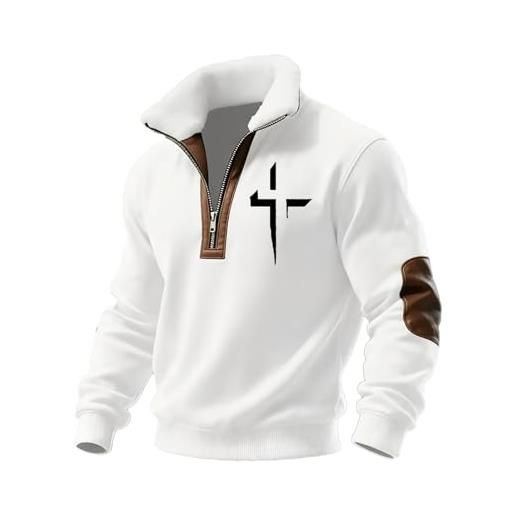 Generic maglione da uomo con cerniera a 1/4, stile vintage, con croce cristiana, foderato in pile, a maniche lunghe, con scollo a v, per autunno e inverno, vestiti caldi, bianco, m